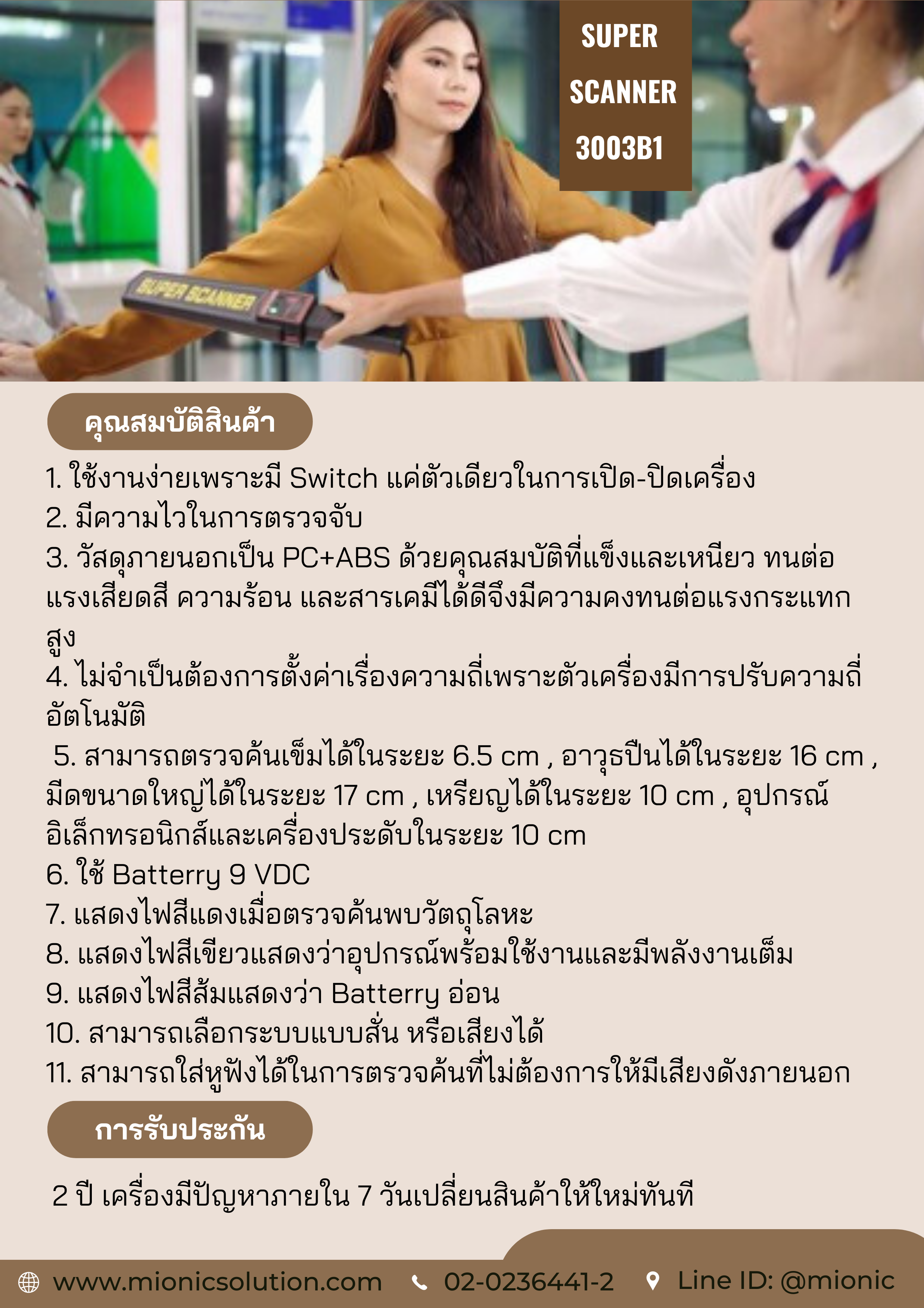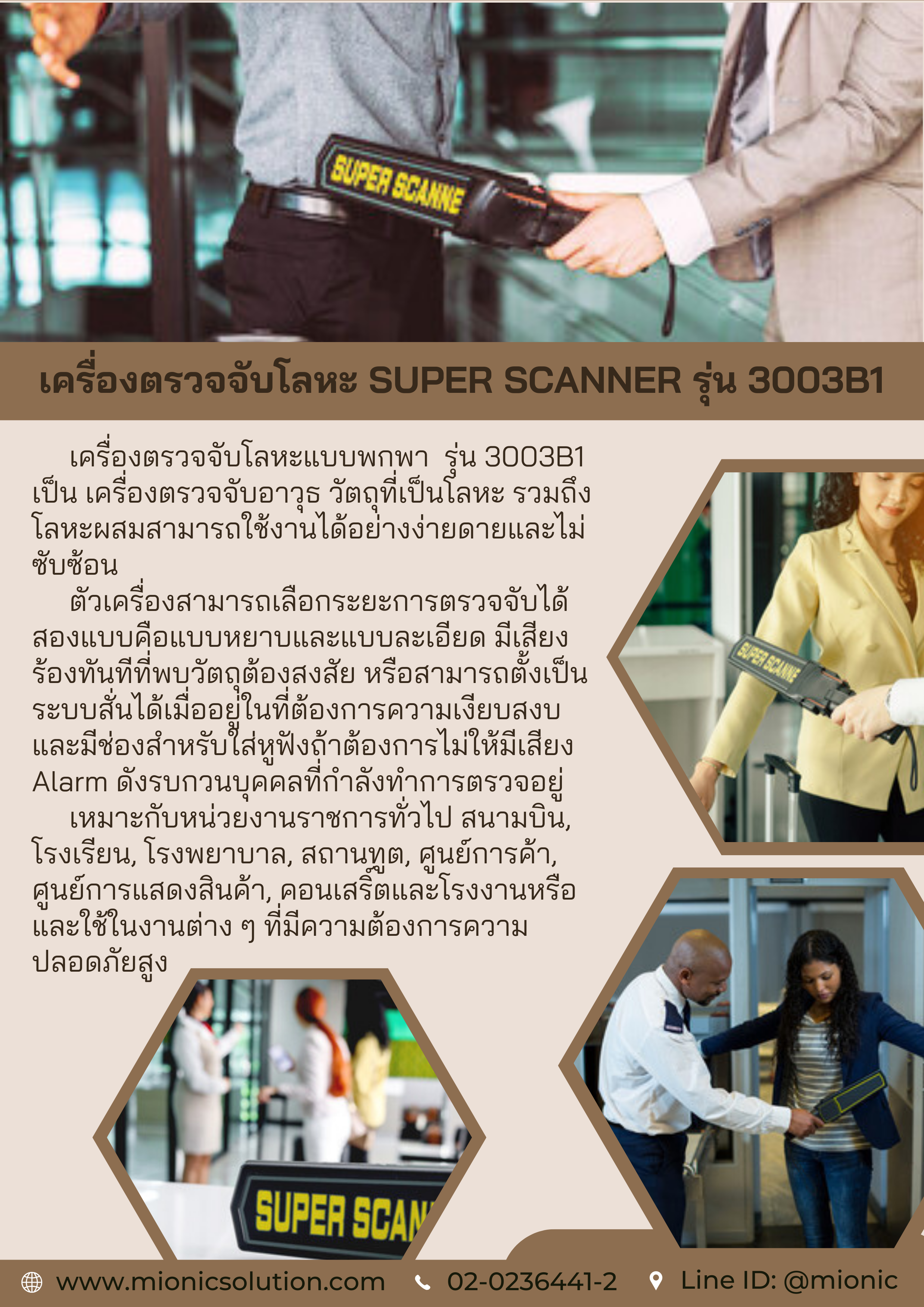 Super Scanner รุ่น 3003B1 เป็นเครื่องตรวจจับอาวุธ วัตถุที่เป็นโลหะ รวมถึงโลหะผสม สามารถใช้งานได้อย่างง่ายดายและไม่ซับซ้อน ตัวเครื่องสามารถเลือกระยะการตรวจจับได้สองแบบคือแบบหยาบ และแบบละเอียด