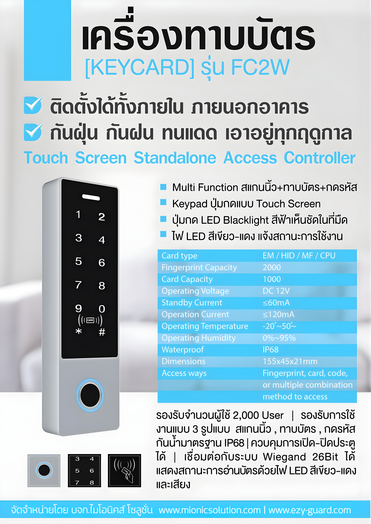 เครื่องทาบบัตร คีย์การ์ด รุ่น FC2W ควบคุมการเปิด-ปิดประตู ที่ถูกออกแบบมาเพื่อทำให้ผู้ใช้สามารถใช้งานได้ง่าย รองรับบัตรได้ 2,000ใบ ตัวเครื่องขนาด 155x45x21mm ตัวเล็กกระทัดรัด แสดงสถานะการเข้างาน ใช้ไฟ DC 12v. เหมาะสำหรับ คอนโด,อพาร์ทเม้นท์,หอพัก,ฟิตเนต,ร้านอาหาร,สถานบันเทิง,สถานเสริมความงาม,และหน่วยงานต่าง ๆที่ต้องการจำกัดสิทธิ์ผู้เข้าประตูได้เท่านั้น