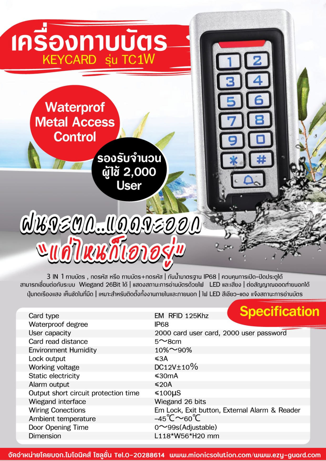 เครื่องทาบบัตร คีย์การ์ดรุ่น TC1W สามารถใช้ได้ทั้งบัตร /รหัสผ่าน ได้ ฟังค์ชั่นครบครัน ปุ่มกดมีไฟแบบ LED สวยงาม มองเห็นชัดเจนในยามค่ำคืน ระยะในการทาบบัตร 2-5 ซม. ปรับเวลารีเลย์ประตู: 0 ~ 99 วินาที