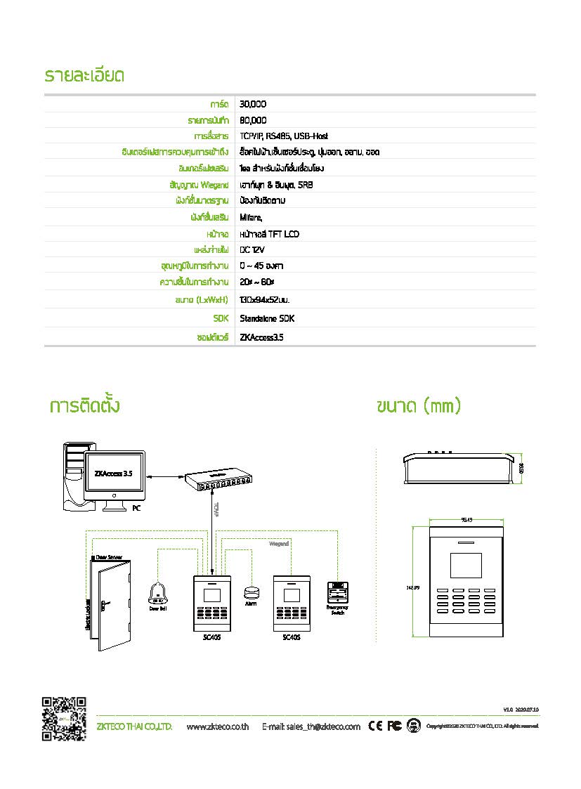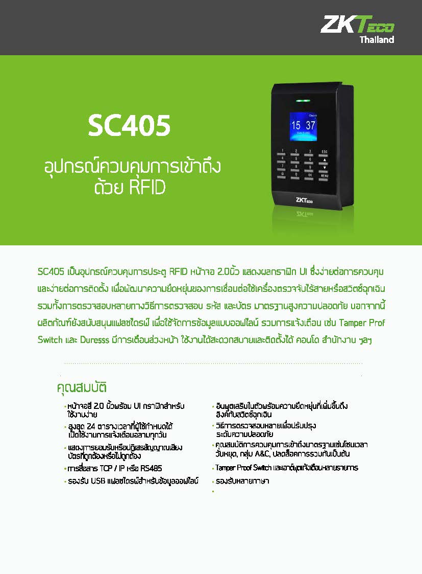 เครื่องทาบบัตรรุ่น SC405 เพื่อบันทึกเวลาทำงาน และควบคุมการเปิด-ปิดประตู ที่ถูกออกแบบมาเพื่อทำให้ผู้ใช้สามารถใช้งานได้ง่ายและสะดวกที่สุด หน้าจอ LCD รองรับบัตรได้ 30,000 ใบ 80,000 Record ตัวเครื่องขนาด 130x94x82mm สามารถโชว์รูป ชื่อและรหัสพนักงานขณะลงเวลาได้ และแจ้งเตือนเสียงภาษาไทยหรือภาษาอังกฤษ แสดงสถานะการเข้างาน ใช้ไฟ 12v.
