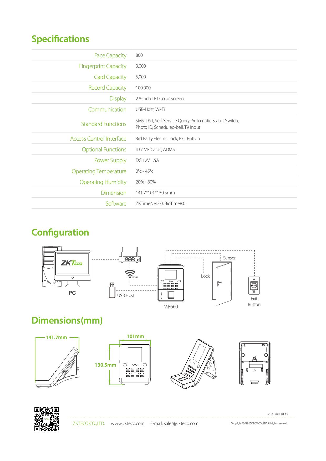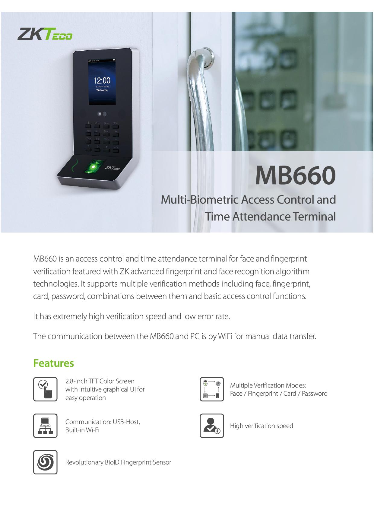 เครื่องสแกนใบหน้ารุ่น MB660 เพื่อลงเวลาทำงานและควบคุมการเปิด-ปิดประตู ถูกออกแบบมาเพื่อทำให้ผู้ใช้สามารถใช้งานได้ง่ายและสะดวกที่สุดจอสี TFT ขนาด 2.8 นิ้ว เมนูไอคอน ใช้งานง่ายรองรับ 800 ใบหน้า 3,000 ลายนิ้วมือ 100,000 Record