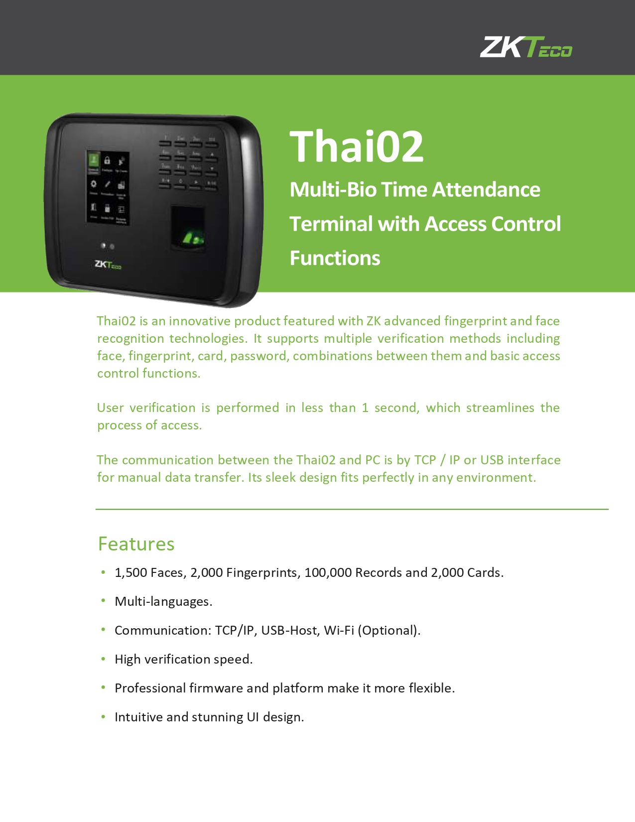 เครื่องสแกนใบหน้ารุ่น Thai02 เพื่อลงเวลาทำงานและควบคุมการเปิด-ปิดประตู ถูกออกแบบมาเพื่อทำให้ผู้ใช้สามารถใช้งานได้ง่ายและสะดวกที่สุดจอสี TFT ขนาด 2.8 นิ้ว เมนูไอคอน ใช้งานง่ายรองรับ 400 ใบหน้า 1,000 ลายนิ้วมือ 100,000 Record