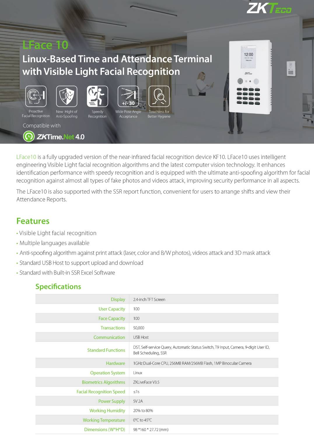 เครื่องสแกนใบหน้ารุ่น LFace10 เพื่อลงเวลาทำงานและควบคุมการเปิด-ปิดประตู ถูกออกแบบมาเพื่อทำให้ผู้ใช้สามารถใช้งานได้ง่ายและสะดวกที่สุดจอสี TFT ขนาด 2.4 นิ้ว เมนูไอคอน ใช้งานง่ายรองรับ 100 ใบหน้า 100 ลายนิ้วมือ 50,000 Record
