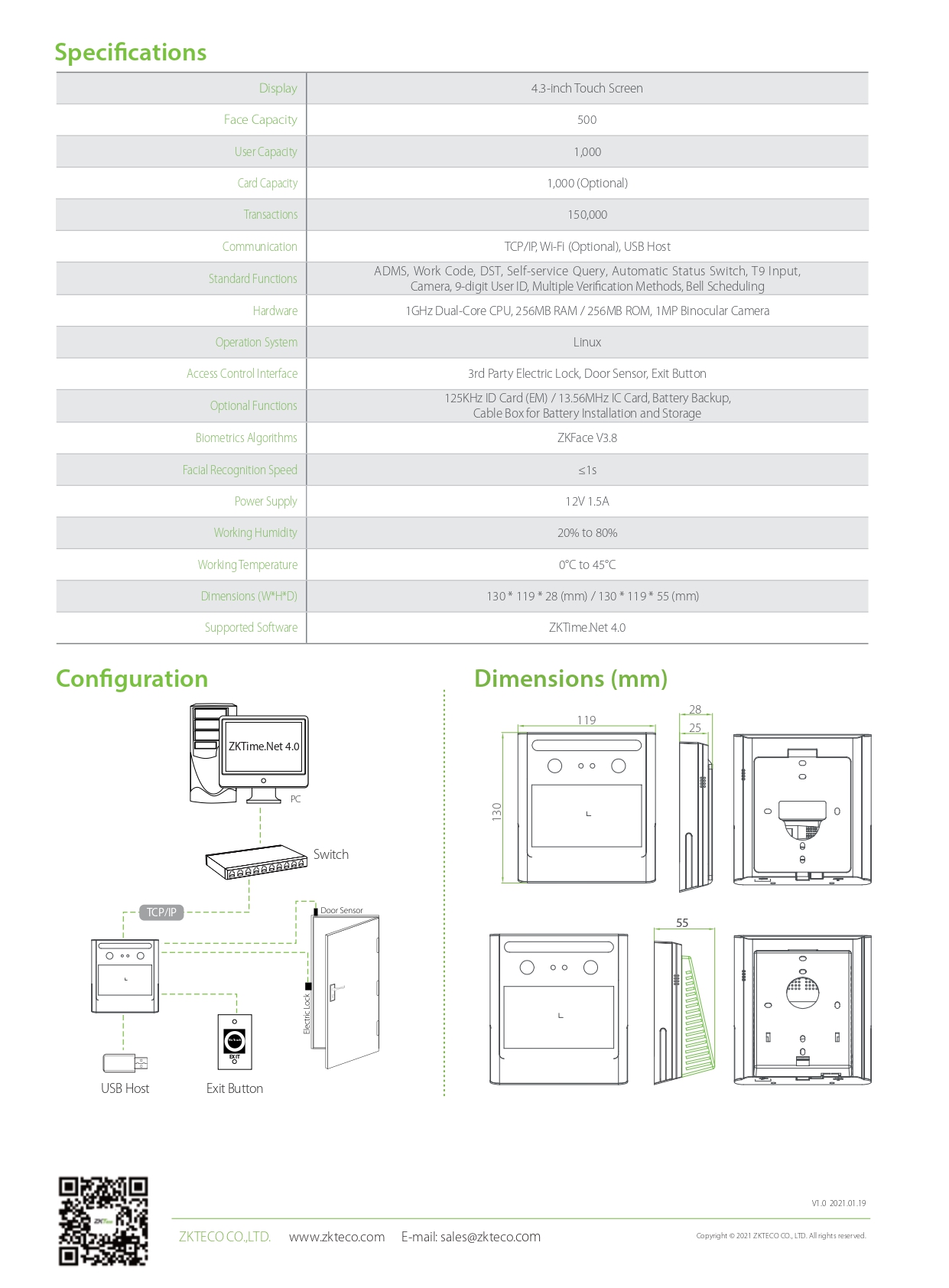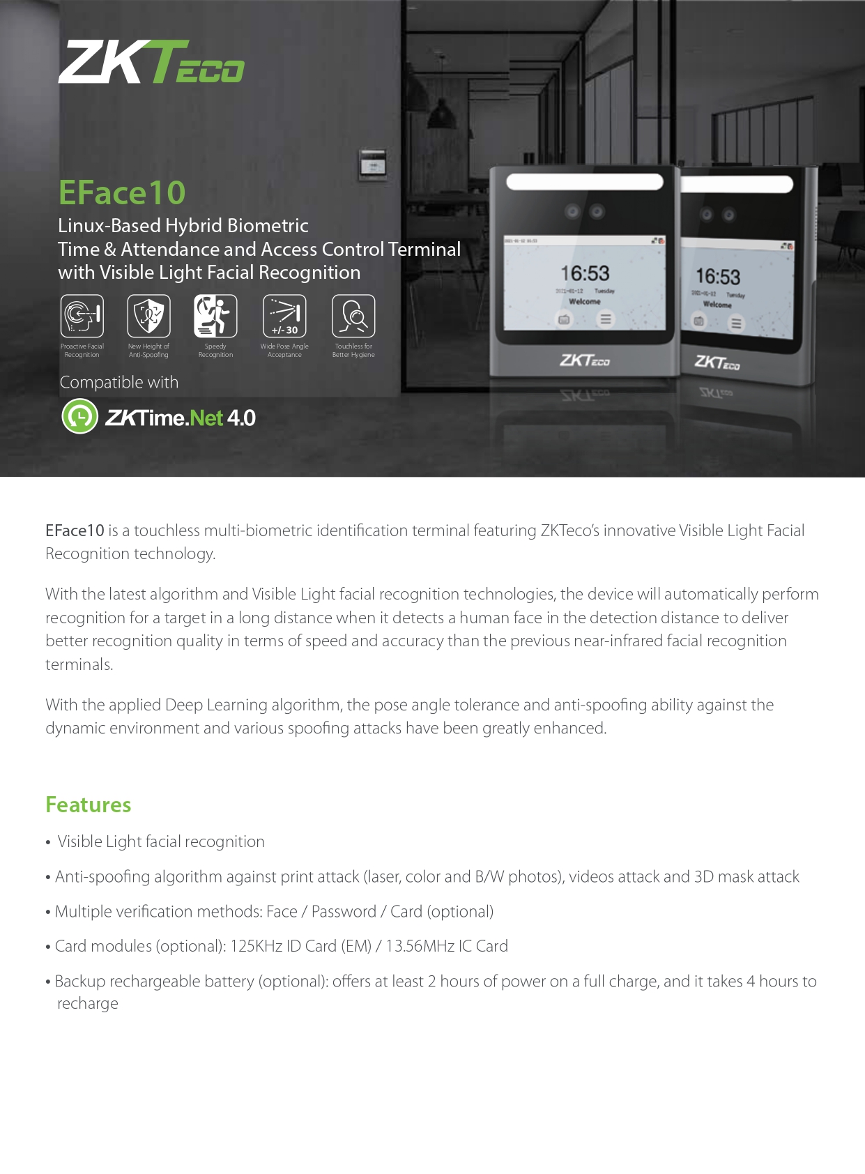อุปกรณ์สำหรับระบุตัวตนด้วยเทคโนโลยีไบโอเมตริกซ์แบบไร้การสัมผัสที่มาพร้อมกับการตรวจสอบใบหน้าด้วยเทคโนโลยี Visible Light สแกนหน้าได้อย่างรวดเร็วแม้แสงน้อย ที่เป็นนวัตกรรมใหม่ของ ZKTeco และด้วยอัลกอริธึมล่าสุดรวมทั้งการตรวจสอบใบหน้าด้วยเทคโนโลยี Visible Light ทำให้อุปกรณ์สามารถตรวจสอบใบหน้าระยะไกลได้โดยอัตโนมัติเมื่อตรวจพบใบหน้าของมนุษย์ในระยะตรวจจับ ซึ่งทำให้มีความรวดเร็วและความแม่นยำในการตรวจสอบใบหน้ามากยิ่งขึ้น นอกจากนั้นยังมีอัลกอริธึม Deep Learning ที่มีความสามารถในป้องกันการปลอมแปลงตัวตนที่จะมาช่วยยกระดับความปลอดให้มีประสิทธิภาพสูงมากยิ่งขึ้น