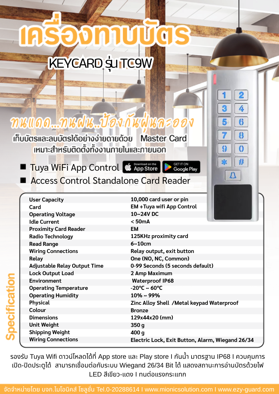 เครื่องทาบบัตร คีย์การ์ด รุ่น TC9W ควบคุมการเปิด-ปิดประตู ที่ถูกออกแบบมาเพื่อทำให้ผู้ใช้สามารถใช้งานได้ง่าย รองรับบัตรได้ 10,000ใบ ตัวเครื่องขนาด 129 (L) x44 (W) x20 (H) มม. ตัวเล็กกระทัดรัด แสดงสถานะการเข้างาน ใช้ไฟ 12v. เหมาะสำหรับ คอนโด,อพาร์ทเม้นท์,หอพัก,ฟิตเนต,ร้านอาหาร,สถานบันเทิง,สถานเสริมความงาม,และหน่วยงานต่าง ๆที่ต้องการจำกัดสิทธิ์ผู้เข้าประตูได้เท่านั้น